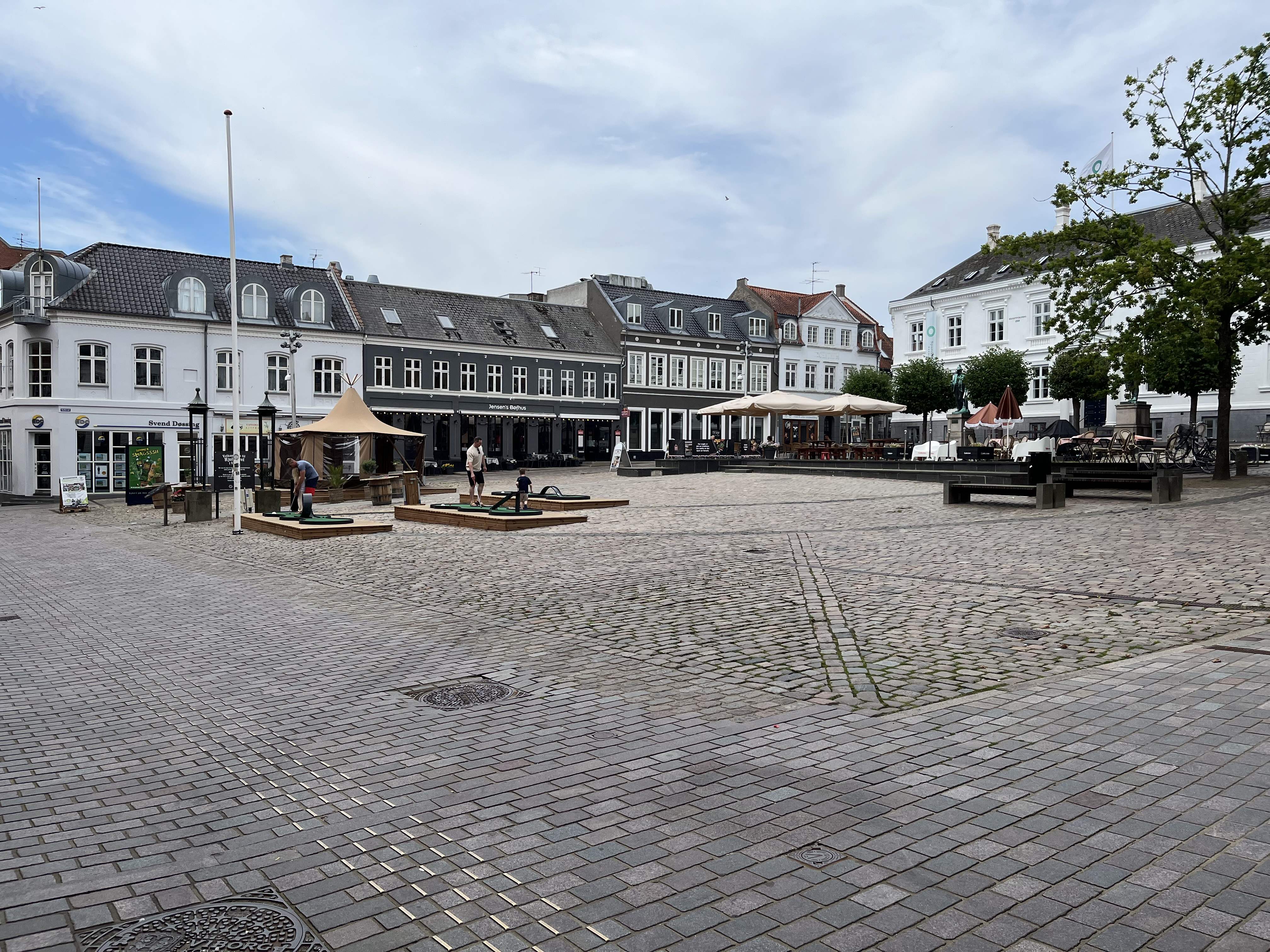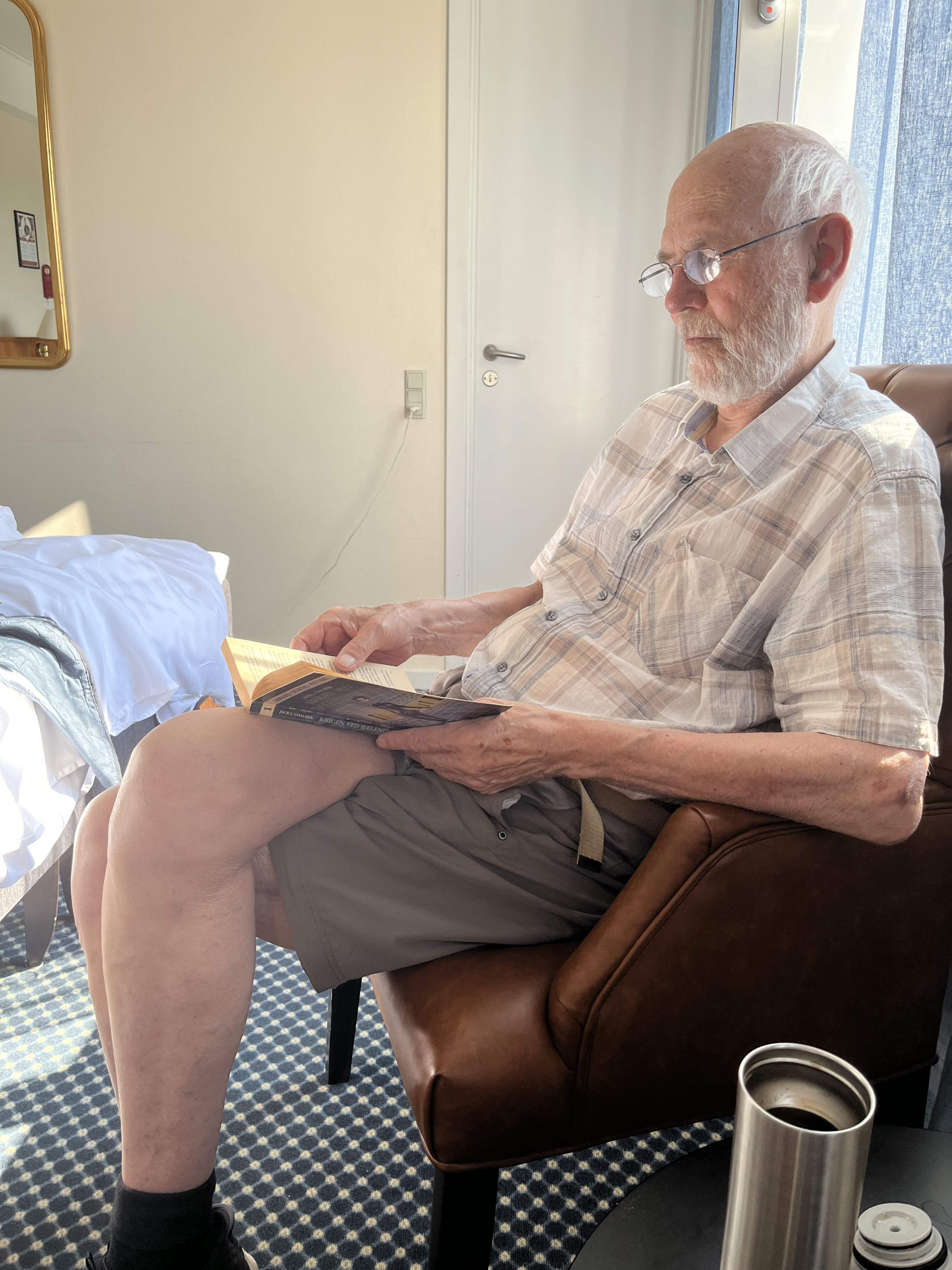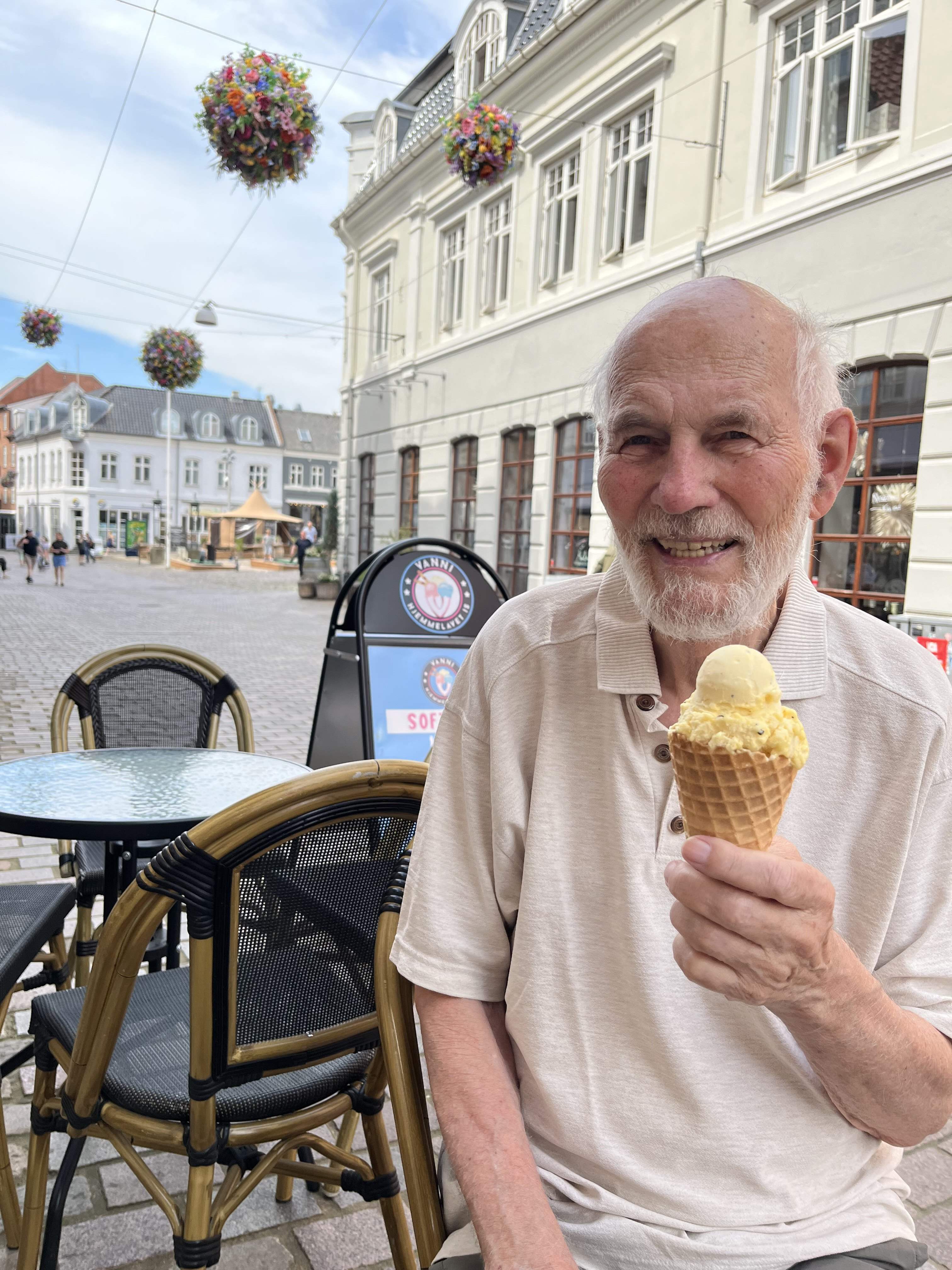 Tor 17 Hjemmefra i god tid til at nå færgen Odden-Århus kl. 10.30 og i Århus kl. 12 og straks afsted til Ålborg. Her blev vi indkvarteret i Milling-hotellet, Hotel Gestus. Her fik vi også vores egen parkeringsplads med opladningsmulighed og det var dejligt, også for vi klarede hele turen på én opladning. Vi fik selv et fint værelse, som vi straks gik i gang med at lufte ud, for her var ca. 100 grader. Så mødtes vi med Mia og Emil i foyeren og spiste kage og kaffe i gårdhaven, |