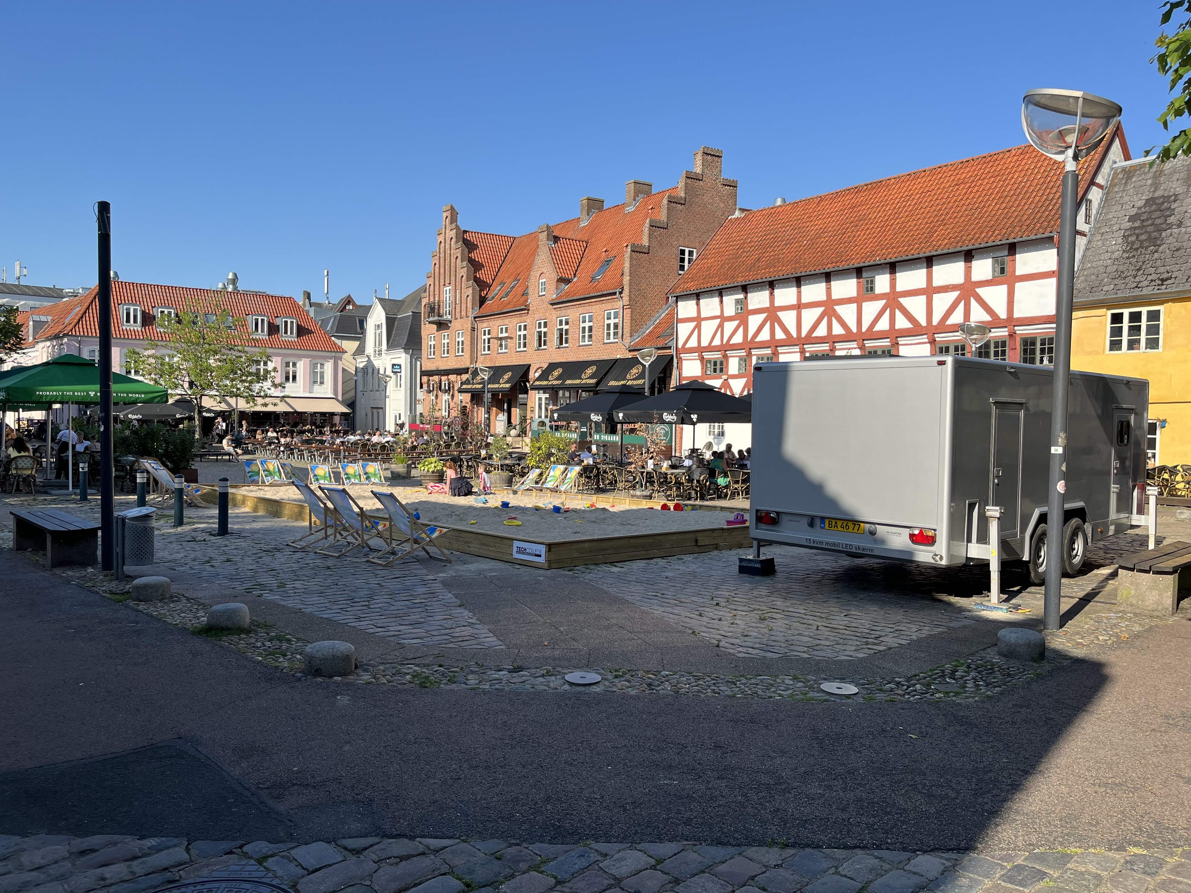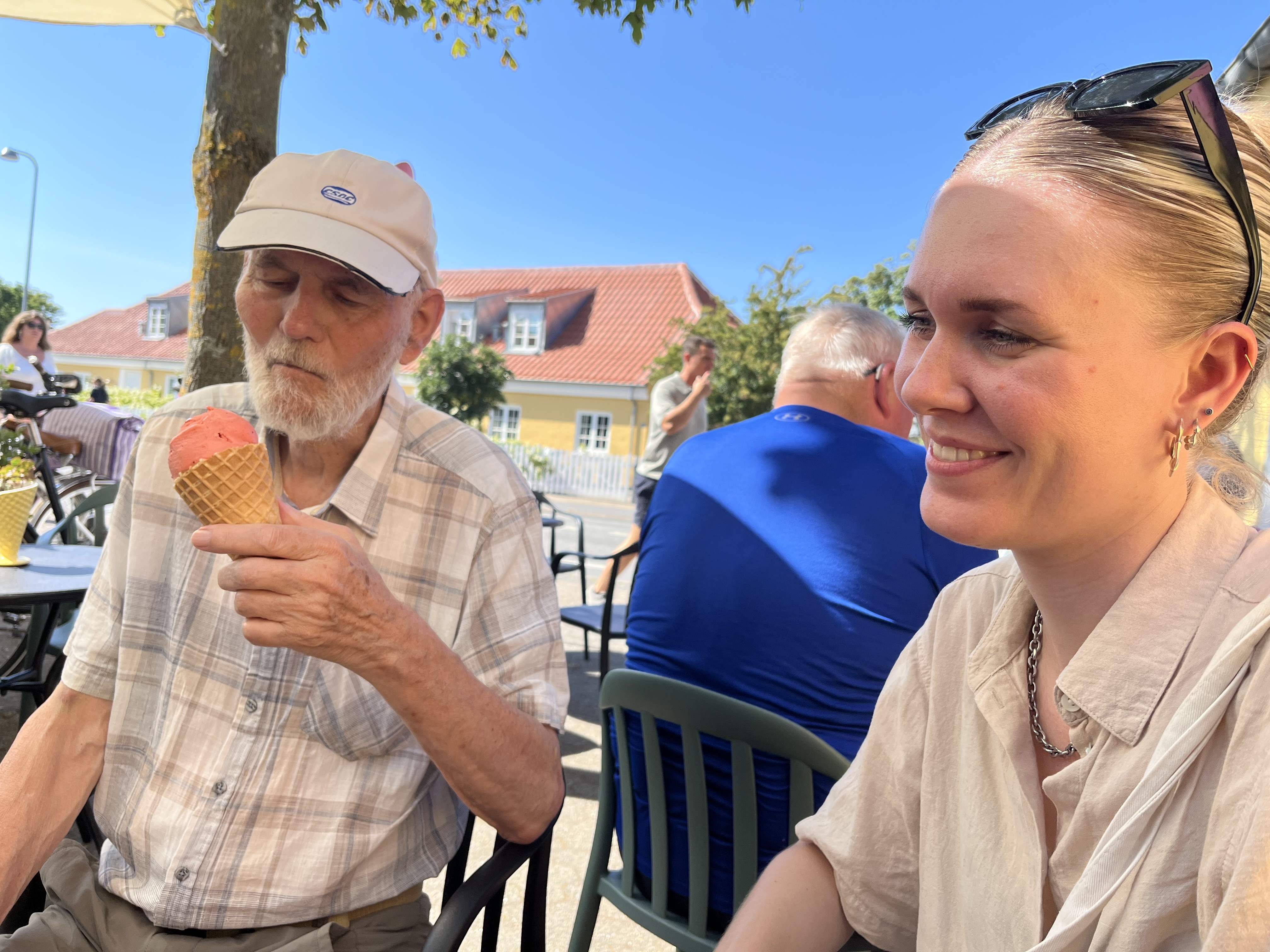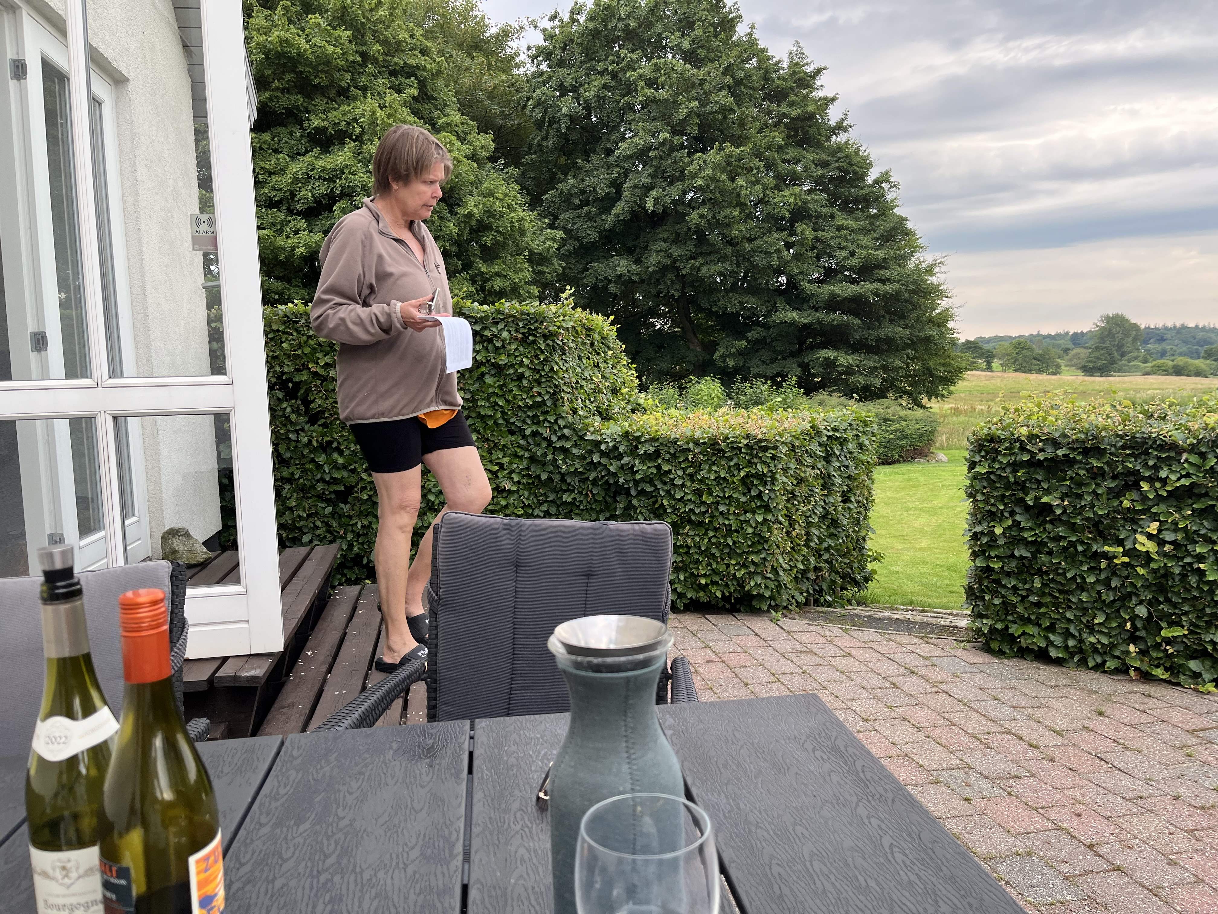 Tor 17 Hjemmefra i god tid til at nå færgen Odden-Århus kl. 10.30 og i Århus kl. 12 og straks afsted til Ålborg. Her blev vi indkvarteret i Milling-hotellet, Hotel Gestus. Her fik vi også vores egen parkeringsplads med opladningsmulighed og det var dejligt, også for vi klarede hele turen på én opladning. Vi fik selv et fint værelse, som vi straks gik i gang med at lufte ud, for her var ca. 100 grader. Så mødtes vi med Mia og Emil i foyeren og spiste kage og kaffe i gårdhaven, |