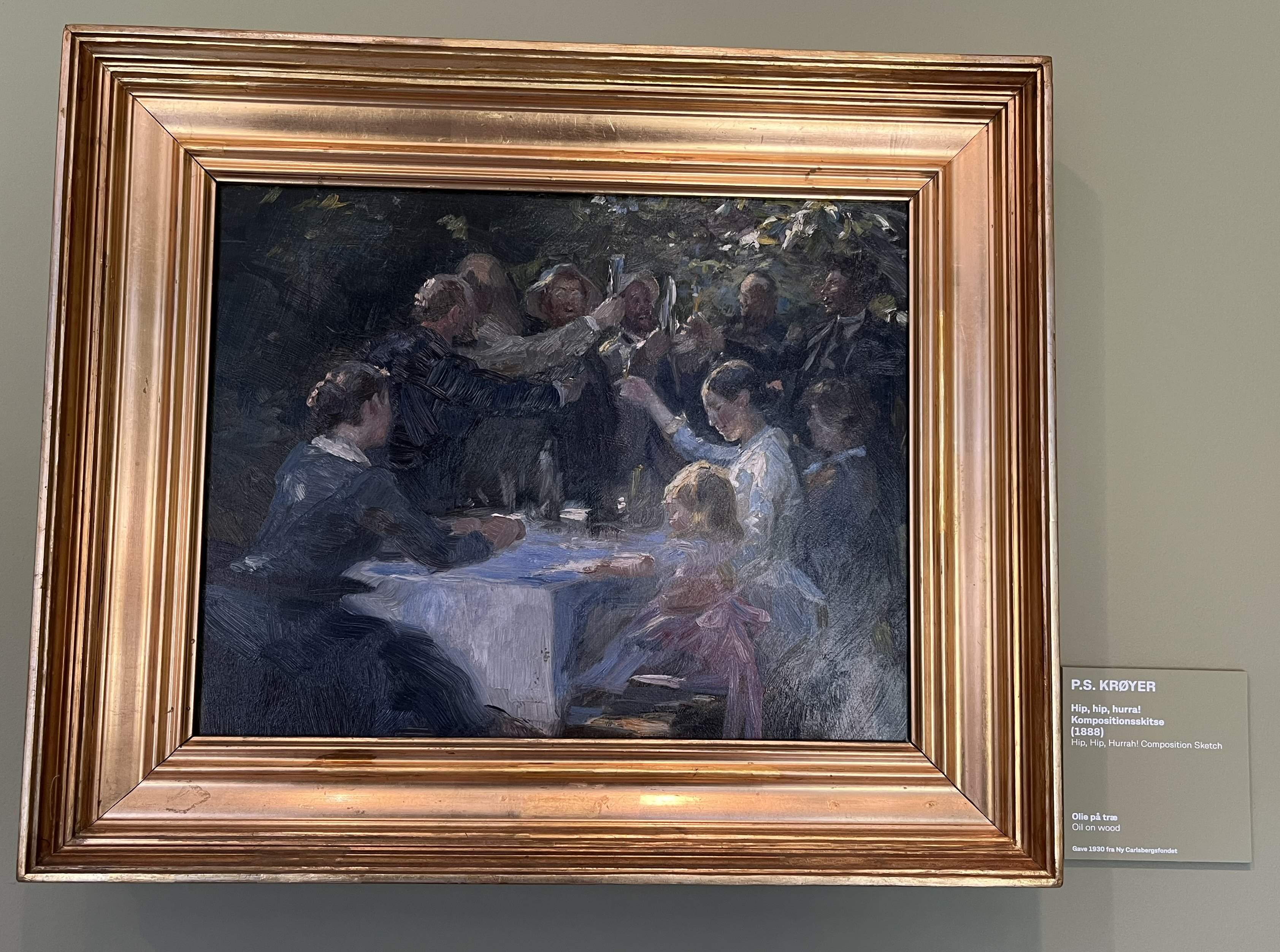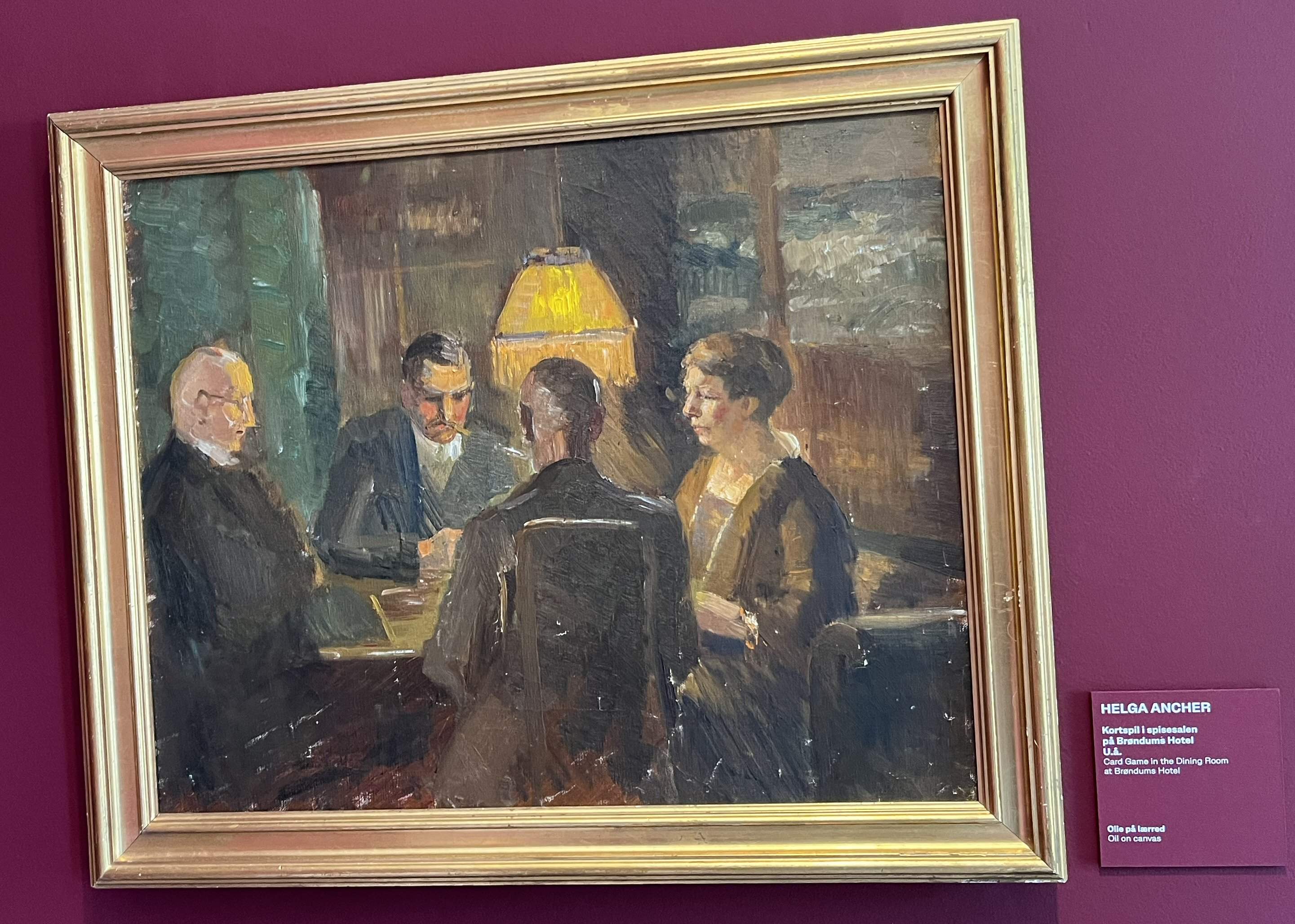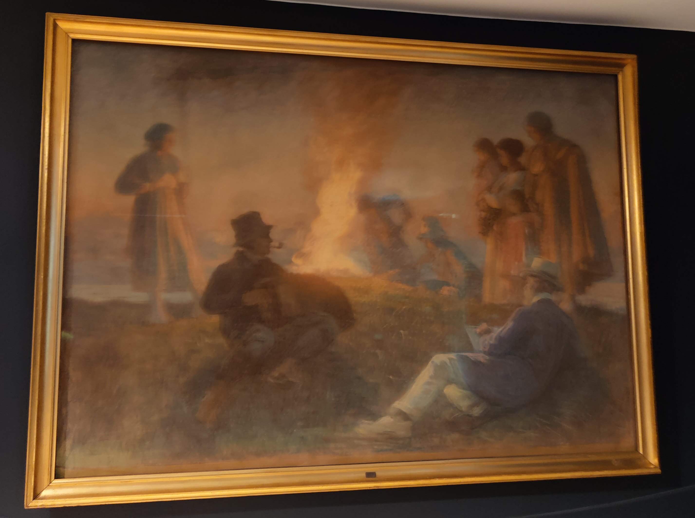 Det var nu midlertidig udstillet her, medens Børsen bliver genopbygget. Og hvorfor bliver det lige opbevaret her? Jo, det er jo malet af P.S. Krøyer. Der var også et andet interessant billede (nr. 18-12), som var ophængt i en meget dunkel belysning. Det var så en øvelse i fordybelse, for efterhånden som øjnene vænnede sig til halvmørket, så kom der flere og flere personer frem på billedet. |