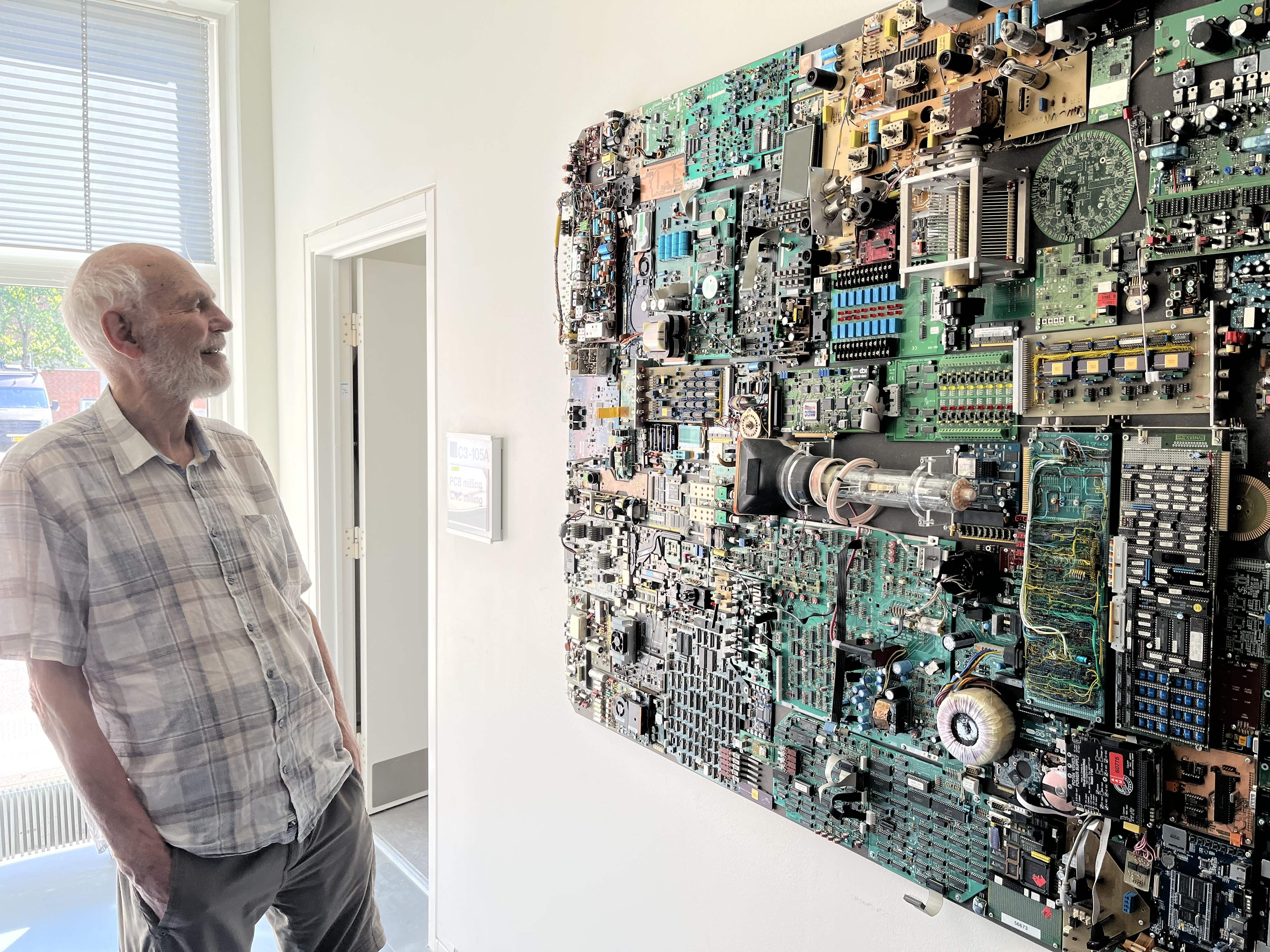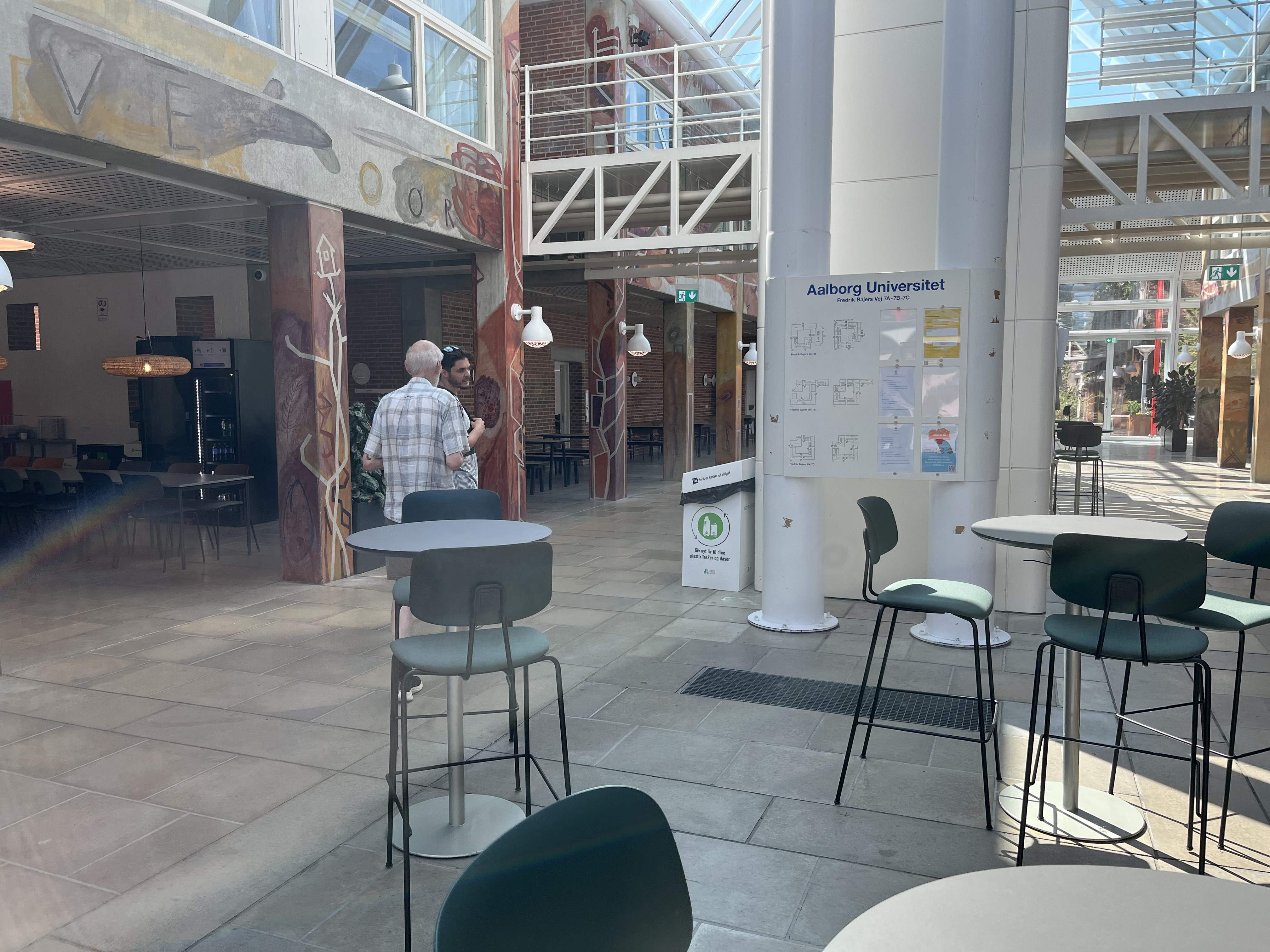 Lør 19 Atter dejlig morgenmad på hotellet. God tid, for vi mødtes først med Mia og Emil ca. 10.30, hvorefter vi hentede bilen og kørte ud til Ålborg Universitet, hvor Emil læser samt har et bijob. Her så vi de forskellige lokaler, som han benytter. I foyeren |